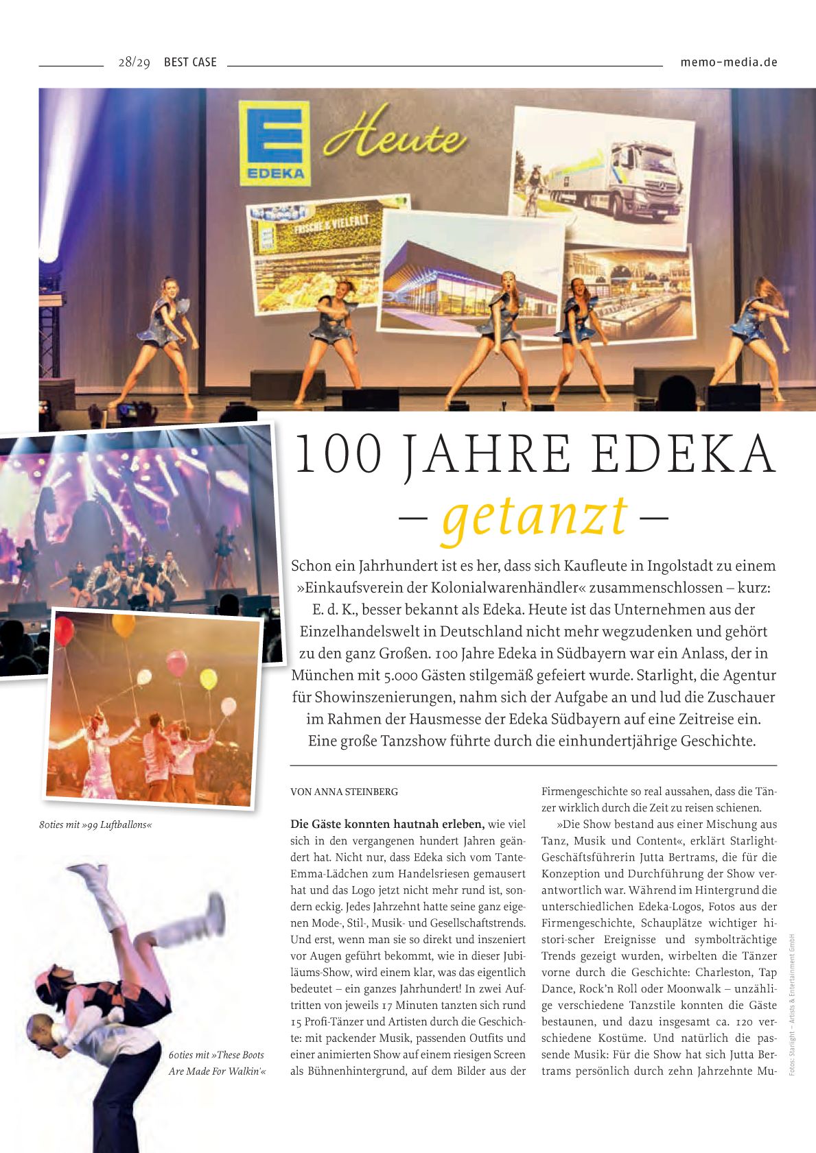 Im aktuellen Magazin showcases gerscheint ein Artikel über unsere Inszenierung „100 Jahre Tanzgeschichte und 100 Jahre Edeka Südbayern“. Showcases richtet sich an Eventmanager, Veranstaltungsplaner und PR-Manager. Anhand von Fallbeispielen zeigt es auf, wie Künstler und Events im Sinne der Kommunikation eingesetzt werden können. Jede Ausgabe widmet sich einem Schwerpunktthema, in der aktuellen Ausgabe ist es Tanz – der neue Trend und wieder ein wichtiges Thema im Eventmarketing.
