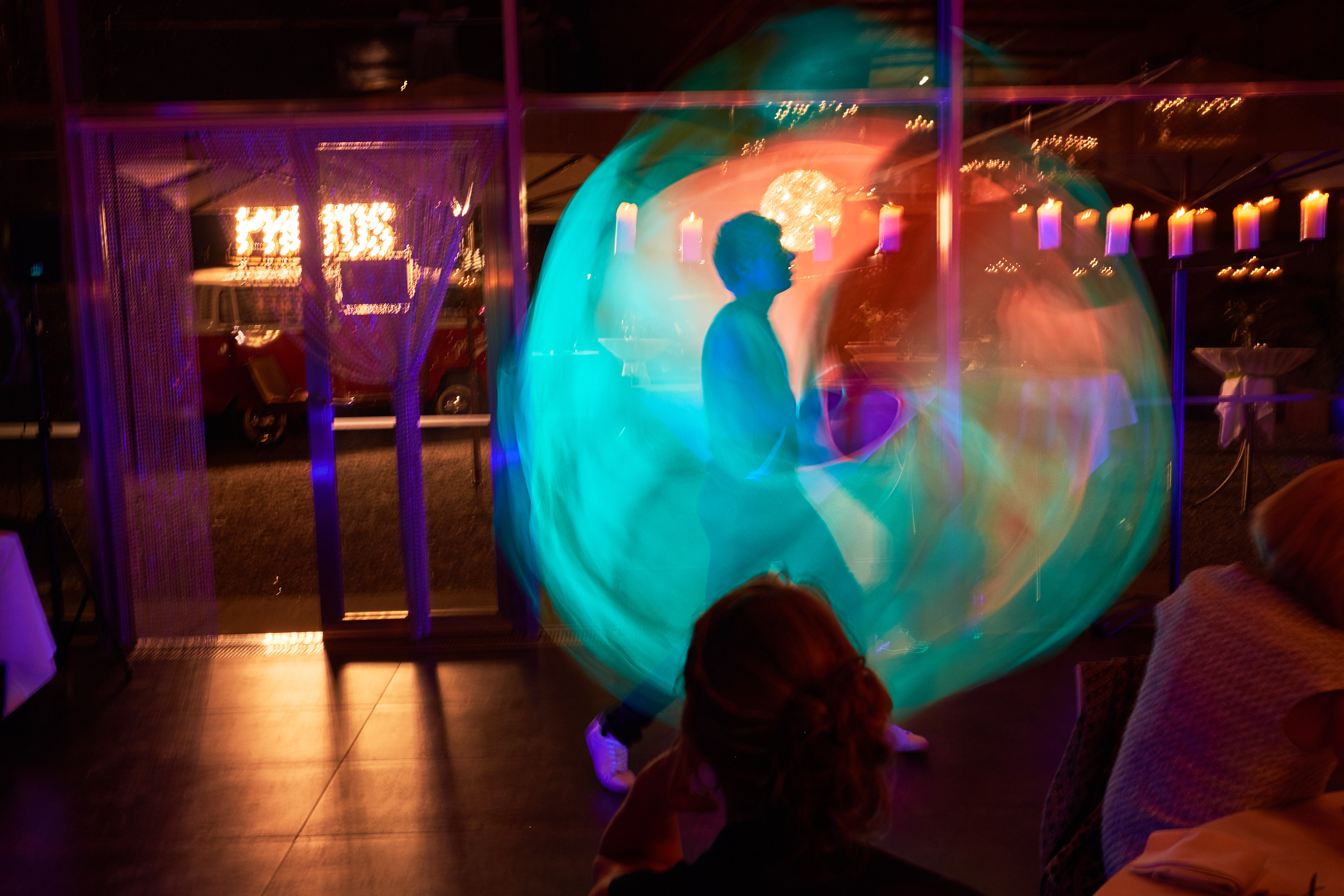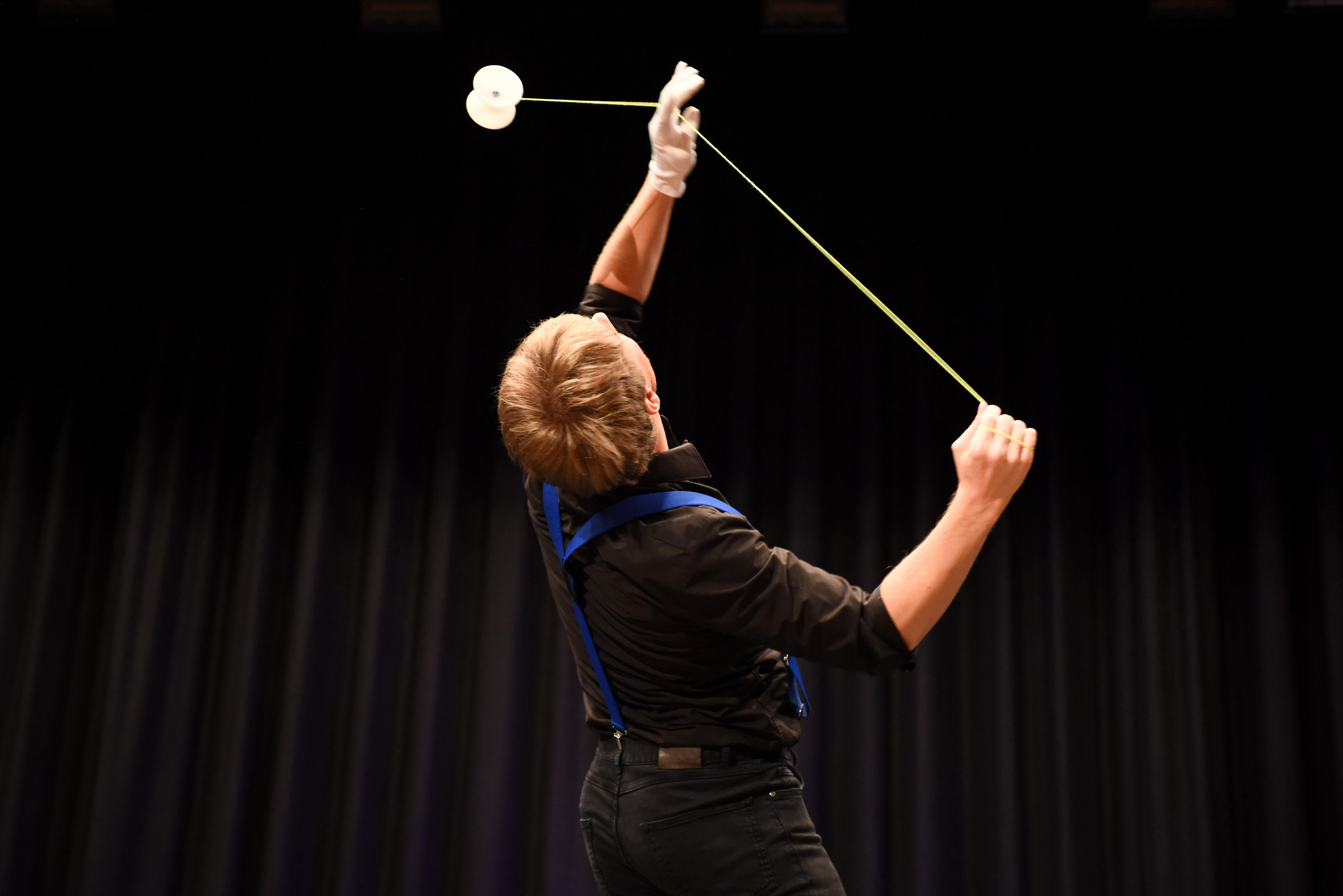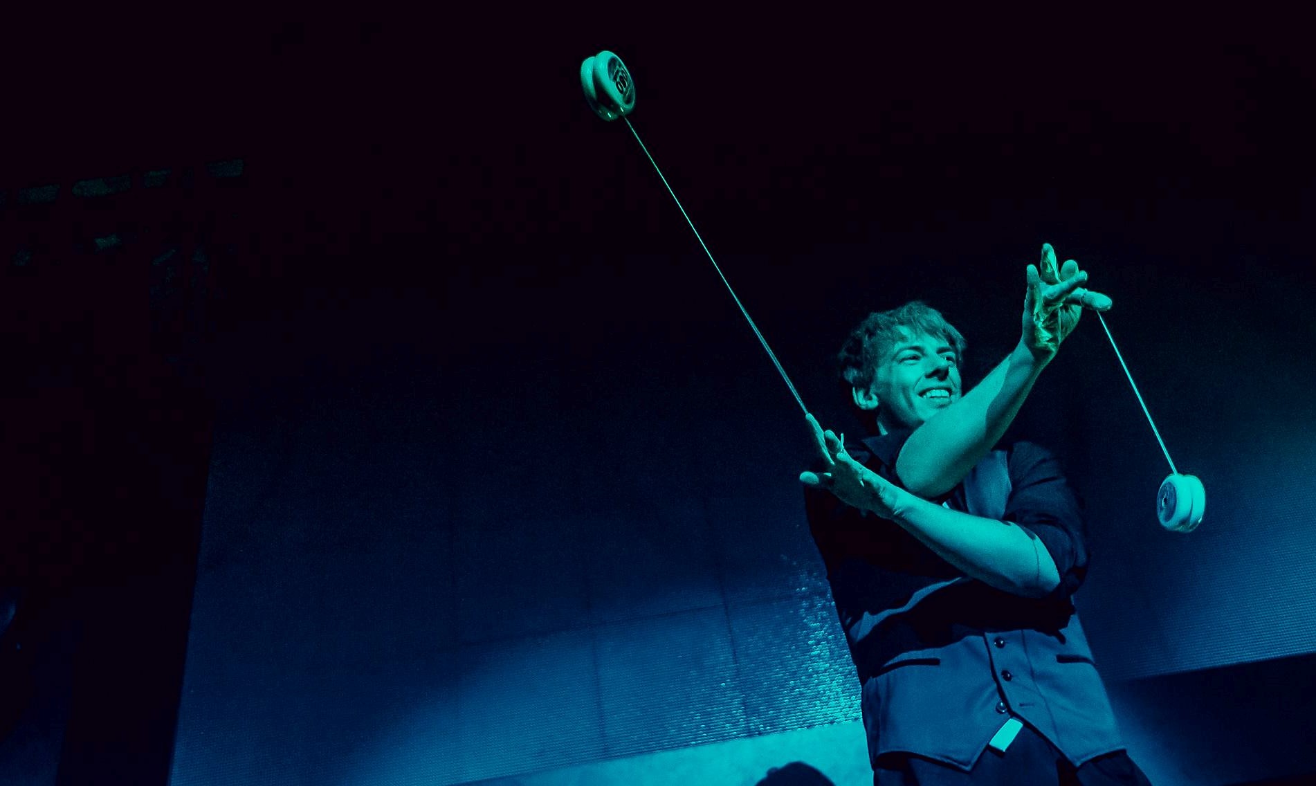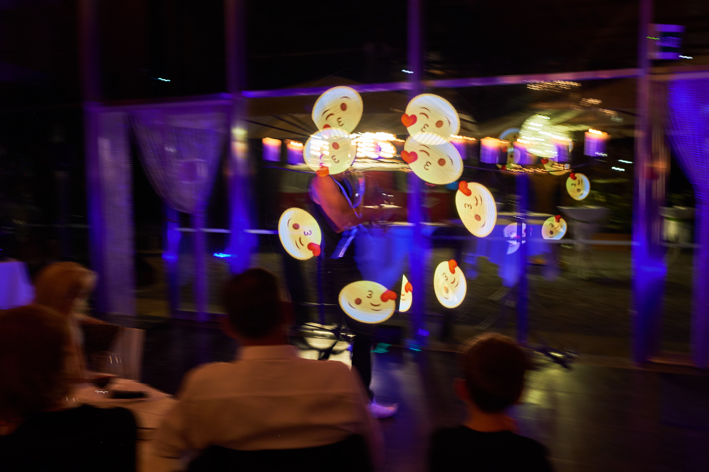 Yo-Yo`s fliegen in seiner Show in alle Himmelsrichtungen – Würfe unter dem Bein, hinter dem Rücken, liegend, sitzend… und als Finale sogar mit verbundenen Augen. Im 2. Teil der Show, zeigt Ivo spezielle LED Effekte und erzeugt Blumen, Smilies, Bilder und zur Begeisterung aller Gäste, auch das Firmenlogo!
